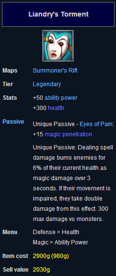 Liandry's Torment -- 50 AP, 300 HP, +15 Magic Penetration. Passive: dealing spell damage burns enemies for 2% of their current HP per second for 3 seconds (6% total). Double damage if movement impaired.